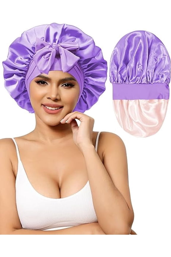 Best seller 2PCS Long Satin Bonnet for Women, Double Layer Elastic Hair Bonnet with 2 Scrunchies & Adjustable Tie Band, Long Satin Bonnet for Sleeping Women Braids Curly Hair (Purplr, Black) From $15.99