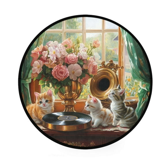 BZSMCE Round Decorative Floor Mat Kittens Flowers Gramophone Record Pattern 36.2IN $26.99