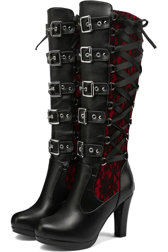 Lace Goth Knee High Boots for Womens Fashion Buckle Block Heel Lace Up Knee Boots for Nightclub Punk Platform Back Zipper Riding Combat Booties From $52.99
