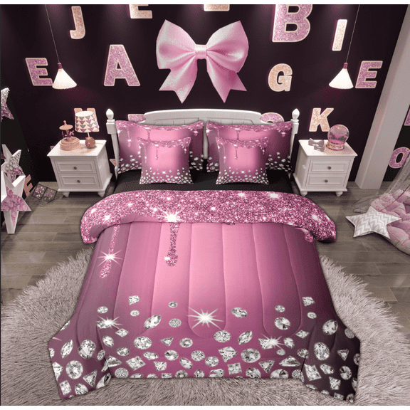 Feelyou Chic Bling Diamond Bedding Comforter Set 7 Pieces, Princess Pink Sequin Print Full Bedding Set, Modern Fashion Reversible Fitted Sheet Flat Sheet, Breathable Home Decor