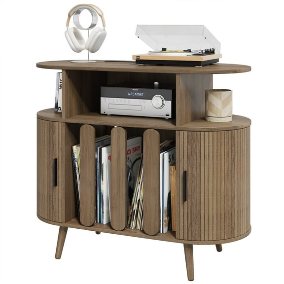 current price $139.99Hersunpl Large Round Record Player Stand with Charging Station & USB Ports Rotating Wooden Louvers Stylish Mid-Century Modern Vinyl Storage Cabinet for Living Room, Bedroom