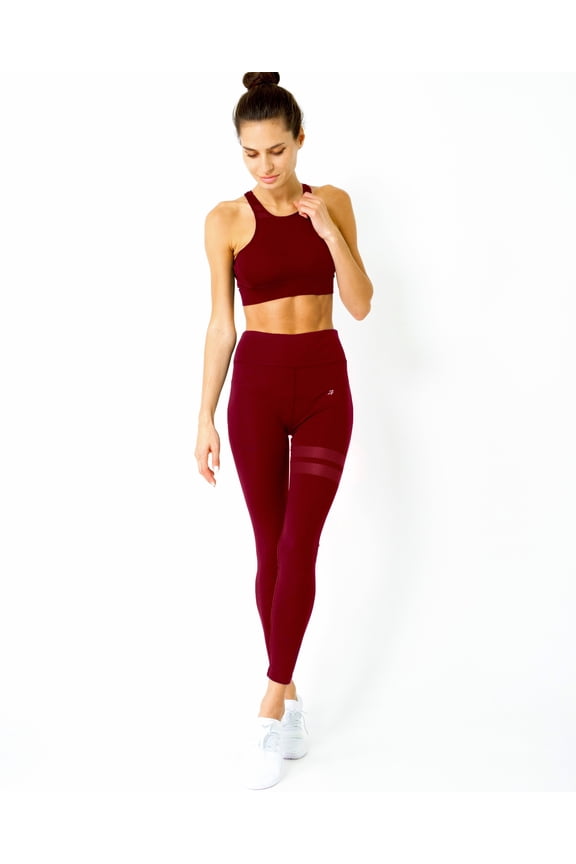 Ashton Racerback Fitting Padded Sports Bra & High Waisted Striped Performance Legging Set - Maroon - MediumMesh Seamless Set - Black