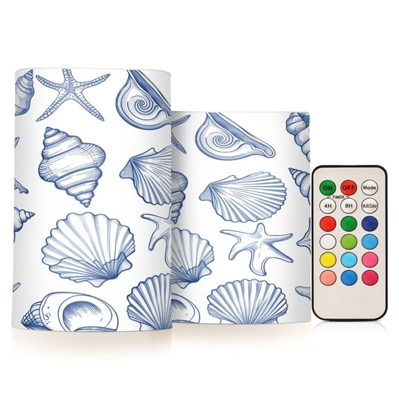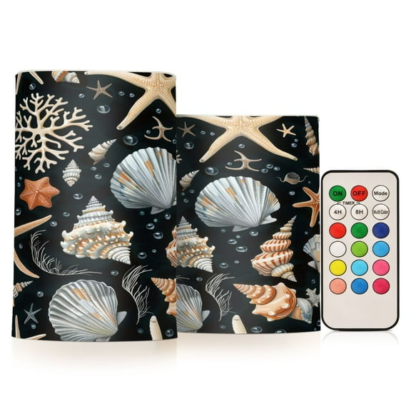 COEQINE Sea Shell Starfish Beach Theme Flameless Candle Battery Powered with Remote Control 12 Colors 4/8 Hours Timer LED Night Lights Pillar Candle Tealights Home Indoor Decor