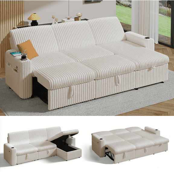 101” Detachable Mattress Sleeper Sofa with Pull-Out Mattress - L-Shaped Design, Adjustable Backrest + Reversible Storage Chaise, USB Ports/Cup Holders, Quick Assembly, Soft Beige Corduroy From $629.99