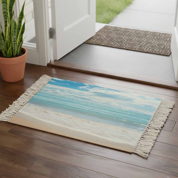 Blue Ocean Bathroom Rug 2'x3', Coastal Sea Beach Shore Sky Waves Scenery Low Profile Front Entryway Rug with Tassels, Woven Cotton Washable Kitchen Mat Carpet for Foyer Bedroom Back Door Decor From $42.01