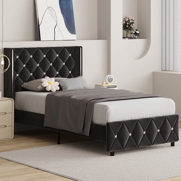 4 EVER WINNER Twin Bed Frame with Silver Trim & Tufted Upholstered Headboard, Velvet Platform Foundation, No Box Spring Needed, Easy Assembly, Black From $121.98