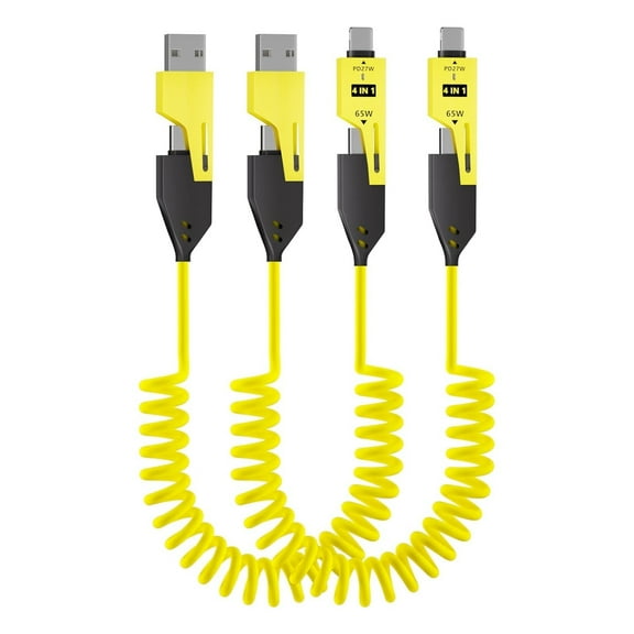 4-in-1 Spring Charging Cable - 4ft 65W Coiled USB Cable for Phones,Laptops,Car Chargers and More,Liquid Silicone Coiled Design,2 Pack(Yellow)