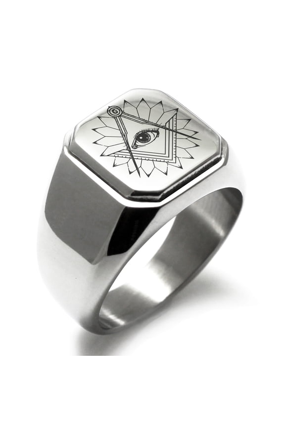 Stainless Steel Freemasons Masonic Lotus All Seeing Eye Engraved Square Flat Top Biker Style Polished Signet RingStainless Steel Freemasons Masonic Eye of Providence Engraved Square Flat Top Biker Style Polished Signet Ring From $15.00