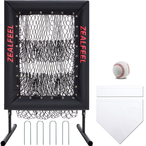 current price $229.99Zealfeel 9-Hole Baseball Pitching Net Pro: 5-Height Adjustable Steel Frame Trainer with Strike Zone, Home Plate, Pitching Rubber and Carry Bag