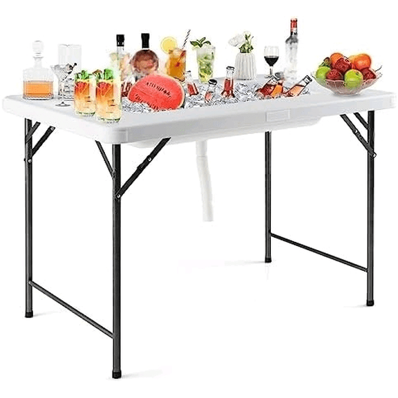current price $99.994ft Portable Ice Cooler Folding Table, Dual-Level Design, Built-in Drain, Detachable Skirt, Perfect for Outdoor Parties, Camping, Picnics, Pools, White$$Garden & Patio
