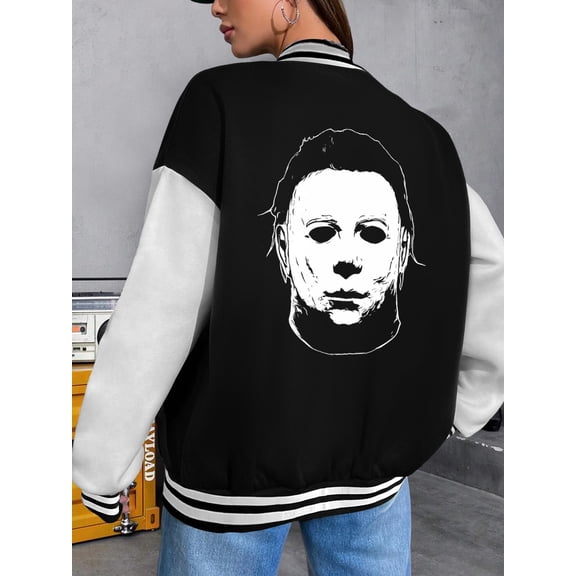 Women's Baseball Jacket Shape Hoodie for Women Halloween Horror Movies Myers Mask Design Scary Shape Bomber Jacket