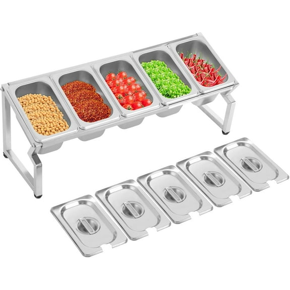 current price $126.48Pizza Topping Station with 5 Pans and Lids, Stainless Steel Condiment Prep Station Food Container Pans, Countertop Spice Organizer Shelf Holder for Seasoning Sauce Salad Jam Fruits Ingredients