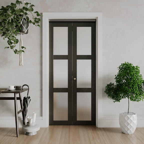 Reduced price 36" x 80" Black 3-Lite Frosted Glass Solid Manufactured Wood Prefinished Bi-Fold Doors With Installation Hardware Kit $256.34 Was $289.58
