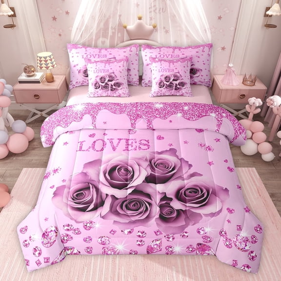 Feelyou 3D Pink Rose Twin Bedding Sets 7-Piece for Couple, Romantic Valentine's Day Bedding Comforter Set, Glitter Fashion Diamond Reversible Sheet Sets, Super Cozy Room Decor From $66.49
