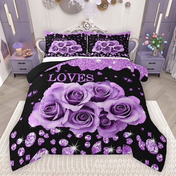 Feelyou Dreamy Purple Rose Bedding Comforter Set for Couple, Romantic Valentine's Day Twin Comforter Sets, Glitter Fashion Diamond Reversible Bedding Set, Microfiber Bedroom Decor, 2pcs From $43.69