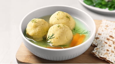 Matzah is an unleavened, crispy flatbread that represents the unleavened bread the Israelites packed when they quickly fled out of Egypt. It's tradition to have three pieces of matzah at the Seder table and then to eat it throughout the upcoming week. Matzah ball soup is another common dish eaten at the Passover meal. The soup contains dumplings made out of matzah meal.