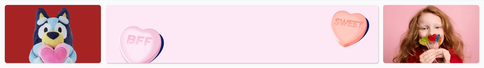 A basket of loveShop moreAdd lots of treats & treasures.Bluey Large Plush, 17 inches, with Heart, by RuzAddNow $16.00current price Now $16.00, Was $22.99$22.99$3.20/eaBluey Large Plush, 17 inches, with Heart, by RuzFun Dip Valentines Day Candy Friendship Exchange Variety Box, 10.32 oz, 24 PouchesAdd$11.40current price $11.40Fun Dip Valentines Day Candy Friendship Exchange Variety Box, 10.32 oz, 24 PouchesMGA's Miniverse - Make It Mini Valentine's Series 2AddNow $12.98current price Now $12.98, Was $15.98$15.98MGA's Miniverse - Make It Mini Valentine's Series 2Bluey Plush Bouquet By RuzAdd$16.89current price $16.89$2.11/eaBluey Plush Bouquet By RuzHello Kitty Heart Box Valentines Gift SetAdd$39.97current price $39.97Hello Kitty Heart Box Valentines Gift SetDisney Stitch Crack Me Up Stitch 11-inch Plush with Sounds and Motion, Wiggles, Giggles, and LaughsAdd$26.95current price $26.95Disney Stitch Crack Me Up Stitch 11-inch Plush with Sounds and Motion, Wiggles, Giggles, and LaughsHello Kitty and Friends - 12-inch Plush Valentine’s Bouquet - 9 Plush Included - Officially Licensed Sanrio product from JazwaresAdd$44.90current price $44.90Hello Kitty and Friends - 12-inch Plush Valentine’s Bouquet - 9 Plush Included - Officially Licensed Sanrio product from Jazwares