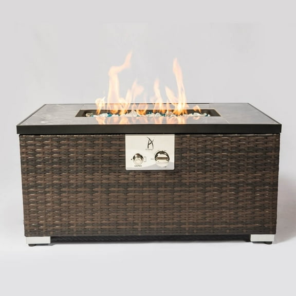 current price $430.00AJ Enjoy 44" Outdoor Fire Pit Table with Glass Wind Guard, 50,000 BTU Auto-Ignition Gas Firepit with Marble Tile Tabletop, Brown PE Rattan