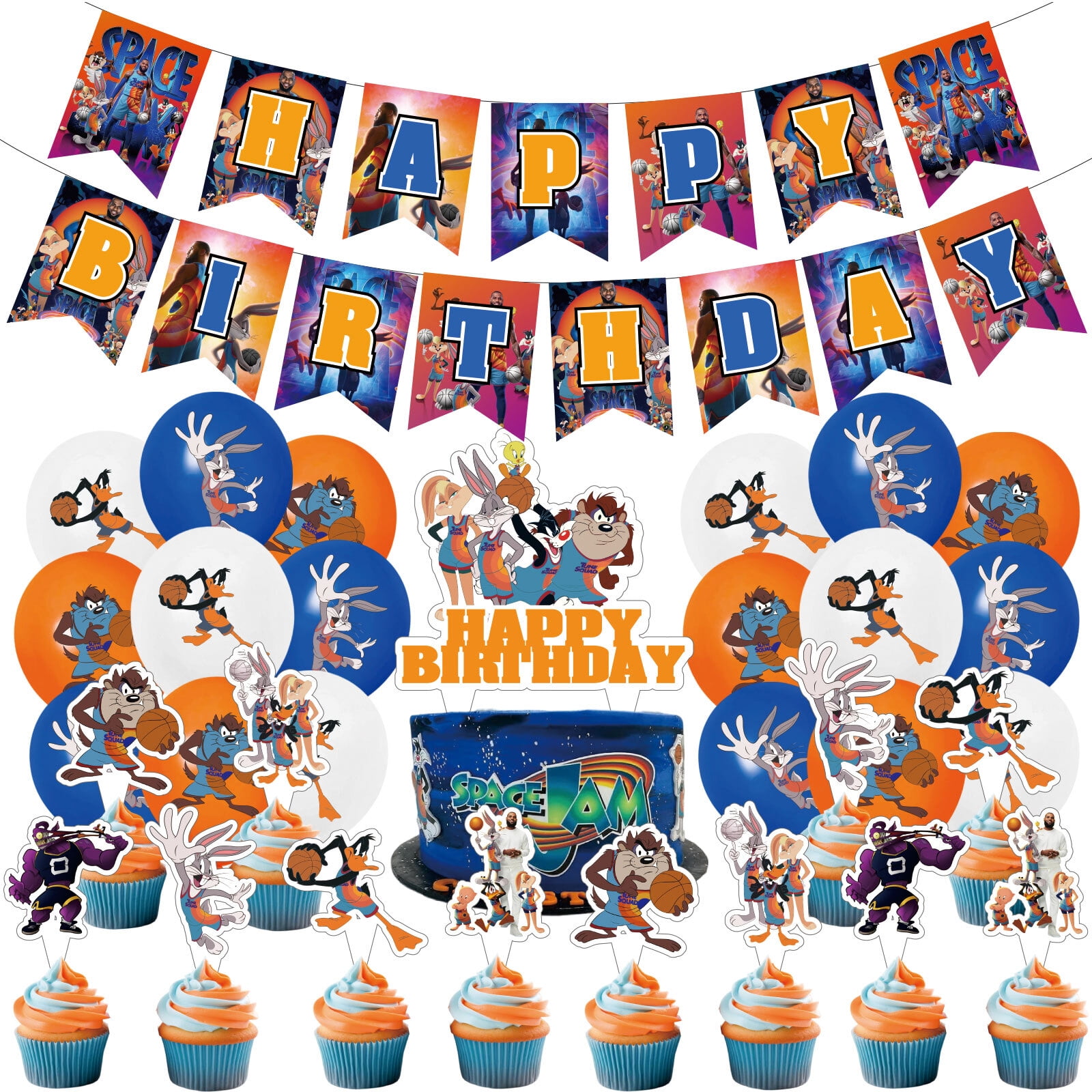 32PCS For Space Jam Theme For A New Legacy Birthday Party Decorations,With 1 Happy Birthday Banner Garland,18 Balloons,13 Cupcake Toppers for Party Supplies