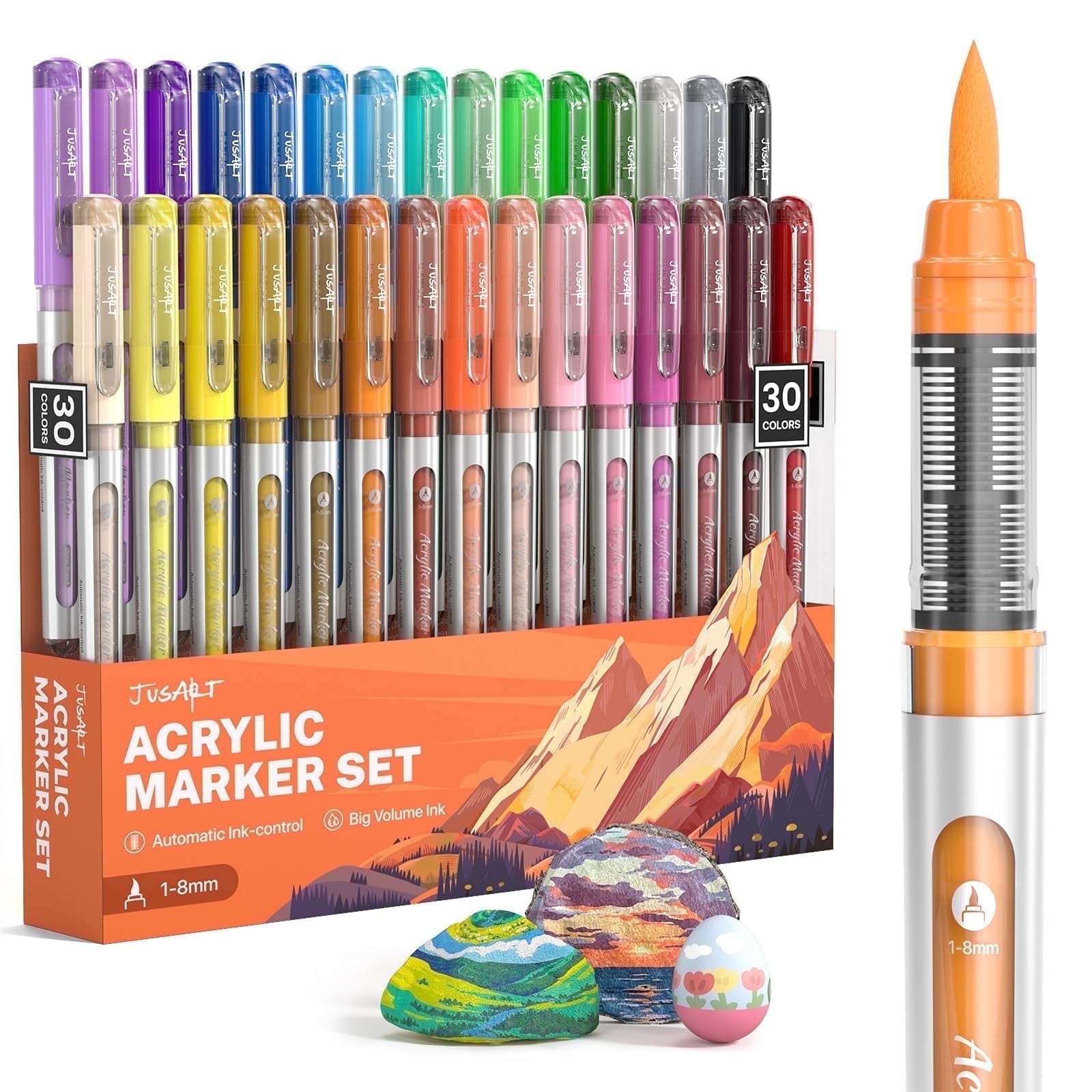 JusArt Acrylic Paint Markers Brush Tip 30 Colors, Water-Based No-Bleed Markers with Automatic Ink Control, Waterproof Acrylic Paint Pens for DIY Art Crafts -Fabric, Rock, Wood, Glass, Ceramic, Metal