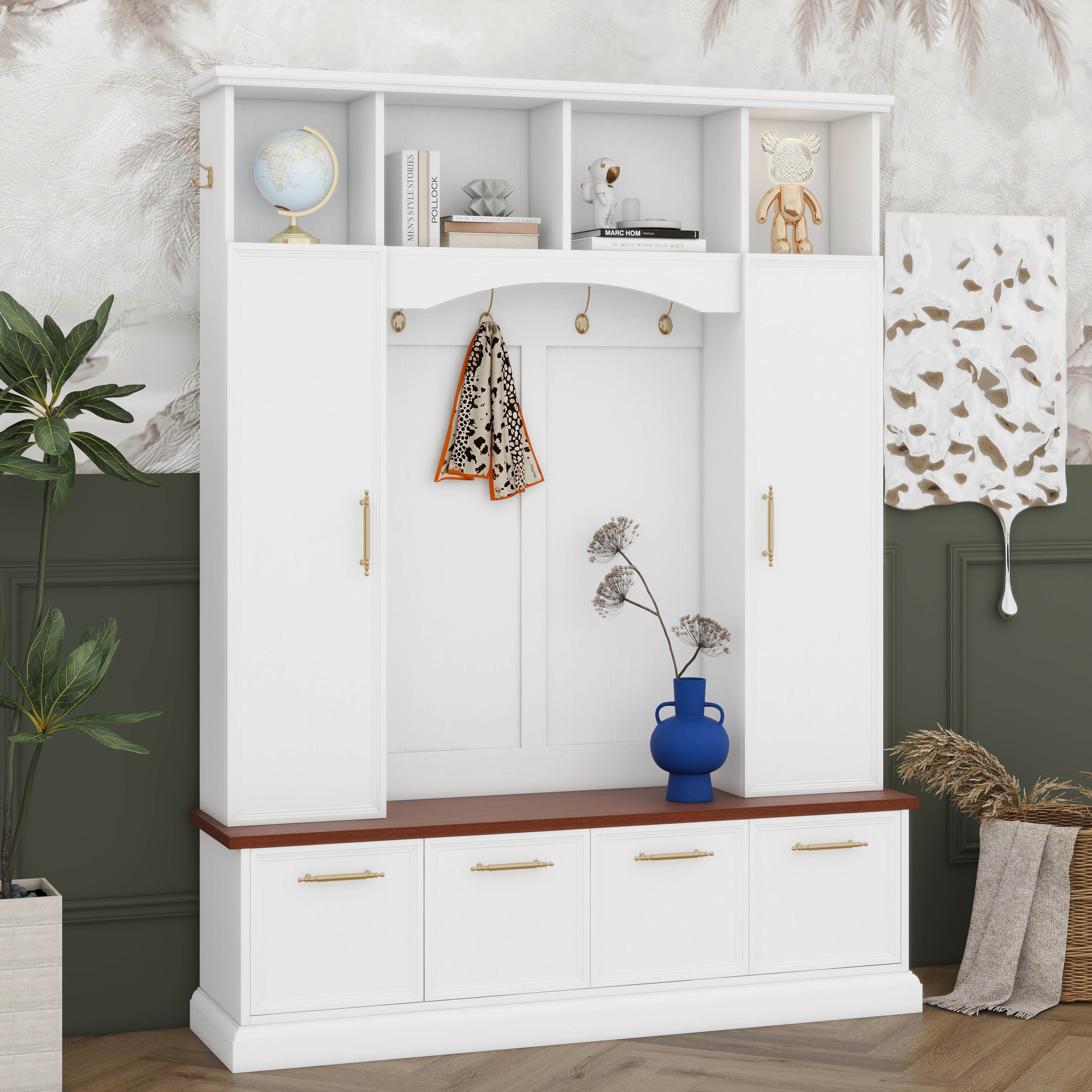Runforrest 4-IN-1 Elegant 59" Wide Hall Tree with Golden Hooks & Handles, Practical Entryway Walnut Bench with Adjustable Shelves, Coat & Shoe Rack for Mudroom, Living Room, White