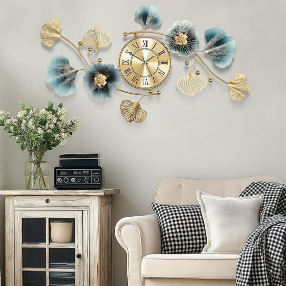 33"Large Wall Clock – 3D Metal Ginkgo Leaf Decorative Wall Clock, Non-Ticking Wall Clocks Battery Operated, Modern Clocks for Living Room, Gift-Ready for Home or Office