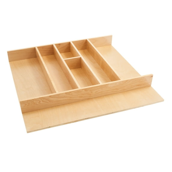 Turn your messy silverware drawer into an organized dream with this Rev-A-Shelf Wooden Kitchen Utility Drawer Insert Organizer. This tray slips into your existing kitchen drawer and instantly transforms a normal drawer into an ideal place to store all of your cutlery and utensils. Organize kitchen drawers with this wood utility tray insert. The 4WUT Series is made of classic maple hardwood with a durable clear finish to ensure an acceptable match to any kitchen cabinet. This modern-day clutter solution requires a simple drop-in installation with 2 sizes that may be trimmed to fit various drawer sizes. From the box, the insert measures 23.98'' wide by 21.97'' deep by 2.64'' high and can be trimmed all the way down to 12'' wide by 17'' deep to fit most shallow drawers. Double check your drawer's opening (inside dimensions) to allow the best fit. Measure side to side (width), front to back (depth or length), and top to bottom (height). Double check to make sure your product is within measurements and don't forget to take into account any obstructions (plumbing, hinges, etc.). With the Rev-A-Shelf Utility Drawer Insert, all of your day-to-day kitchen utensils will be neatly organized and stored efficiently to keep all your spoons, forks, and knives in a single location.