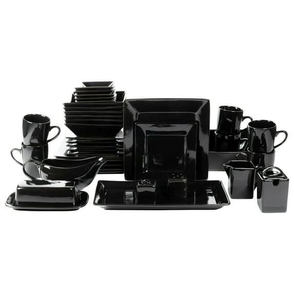 Upgrade your collection with the 10 Strawberry Street Nova Square Banquet 45-Piece Dinnerware Set in Glossy Black. This comprehensive set includes a full place service for six guests, plus all of the essentials needed for serving and more. The Ten Strawberry Street set includes dinner plates, salad plates, bowls, sauce dishes and mugs. Plus a large serving bowl, a rectangular platter, a butter dish with lid, salt & pepper shakers, a lidded sugar bowl and a milk creamer for a comprehensive table setting. The square dinnerware set creates a stunning table aesthetic with its contemporary square design. Suitable for oven-to-table use, each piece is made of durable stoneware and is microwave and dishwasher safe.