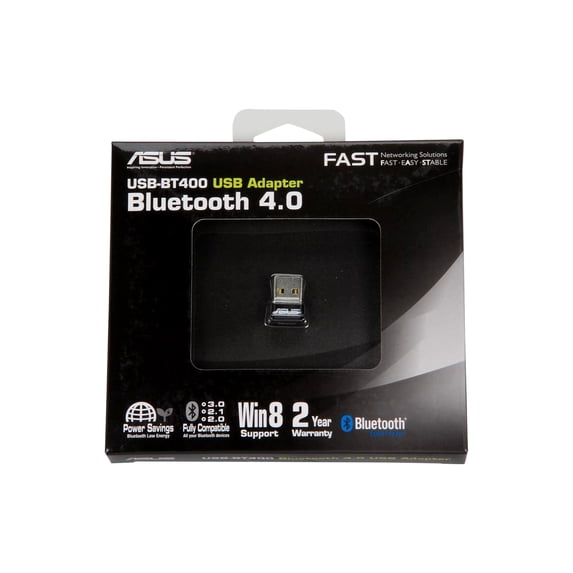 AS-BT400 Asus USB-BT400 Bluetooth 4.0 USB Adapter, Specifications Mfr Part Number: USB-BT400, Features: Most advanced Bluetooth 4.0 adapter, backward compatible with Bluetooth 2.0/ 2.1/ 3.0, Enables wireless communication with Bluetooth-enabled computers, printers, phones, headsets, speakers, keyboards, controllers, and more, Bluetooth Low Energy technology for energy-saving wireless connectivity, Highly portable ultra-small design, , Standard: Bluetooth V4.0, Interface: USB 2.0, Data Rates: Up to 3Mbps, Distance of Use: Over 10 meters in free space, Frequency Band: 2.4 ~ 2.4835GHz unlicensed ISM band, Spectrum: FHSS (Frequency Hopping Spread Spectrum), Modulation: GFSK for 1Mbps, TT/4-DQPSK for 2Mbps, 8-DPSK for 3Mbps, OS Support: Windows 8/ 7/ XP (32/64-bit), Dimensions (WxDxH): 19.47 x 16.00 x 8.10 mm, Weight: 2.2 g,