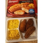 - This hearty frozen dinner features breaded chicken patties, macaroni and cheese and sweet corn