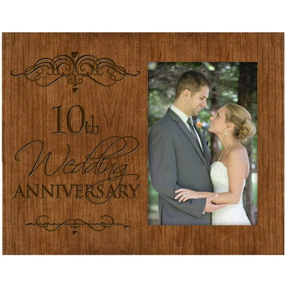 Our customers appreciate the attention to detail and elegant look of this 10th wedding anniversary photo frame, designed to last for generations. The Cherry wood provides a warm look that accents any decor. Holds vertical photo size 4" X 6" inches. The message is as follows:10TH WEDDING ANNIVERSARY " The sentiment is delicately laser engraved. One piece of glass protects the photo. A personalized wedding photo frame shows off a keepsake wedding day memory, elegantly engraved with scripted bride and groom name and wedding date. Crafted in the USA of solid wood for wall or tabletop display; Cherry finish. The frame is 8" x 10" x .5" and displays one 4x6" vertical photo. Decorative embellishment adds to the finishing touch. Personalization is included in the price of the photo frame and includes one line of script for the names and one line for the date.�