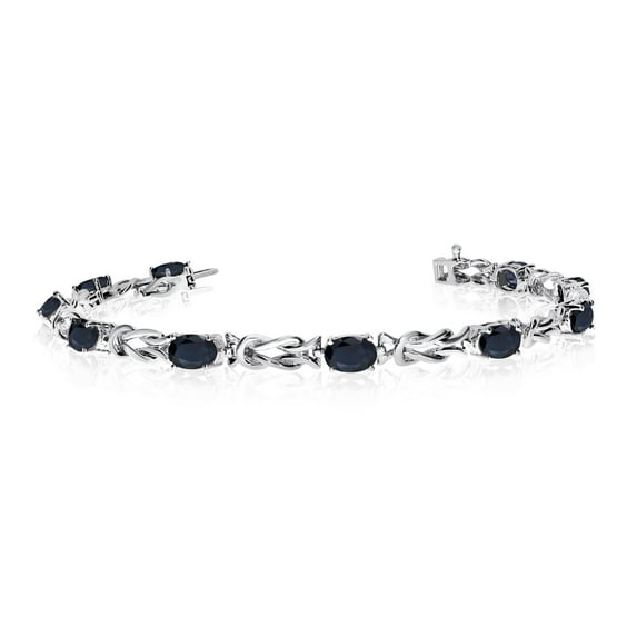 This 14k white gold oval sapphire reef knot bracelet features ten 6x4 mm stunning natural sapphire stones with a 6.00 ct total gem weight.September Birthdays: Sapphire is the birthstone for those born in the month of September. Sapphires traditionally have a brilliant blue hue, giving them a classic look that can be worn any time of year, but they also come in more trendy, modern shades like pink.Give as a Gift: Made from genuine, high quality gold and gemstones, this fine jewelry makes an excellent gift, perfect for birthdays, as a romantic anniversary gift, holiday gift, or for a special occasion. Help a loved one celebrate a special milestone, whether it is sweet sixteen, prom, graduation, a new job or a new baby, the right piece of fine jewelry can enhance any moment! Meaningful Beauty: The right piece of jewelry will allow you to create elegant, sophisticated looks for formal events, or add a luxurious element to your day to day or business wear. But you can also use fine jewelry to add some symbolic meaning to a look or gift choice, choosing gem that aligns with a birthstone, Zodiac sign or even the day of the week a person was born! Alternately, choose a flattering or favorite color gemstone. General Care: Preserve your fine jewelry and keep it looking its best with proper storage and cleaning. Store jewelry in a clean, dry place and inspect your jewelry at least once a year for loose prongs, worn mountings and general wear and tear. Avoid using harmful chemicals, makeup and hair products as these can damage your jewelry. A professional cleaning is advised one per year to help maintain these cherished items.