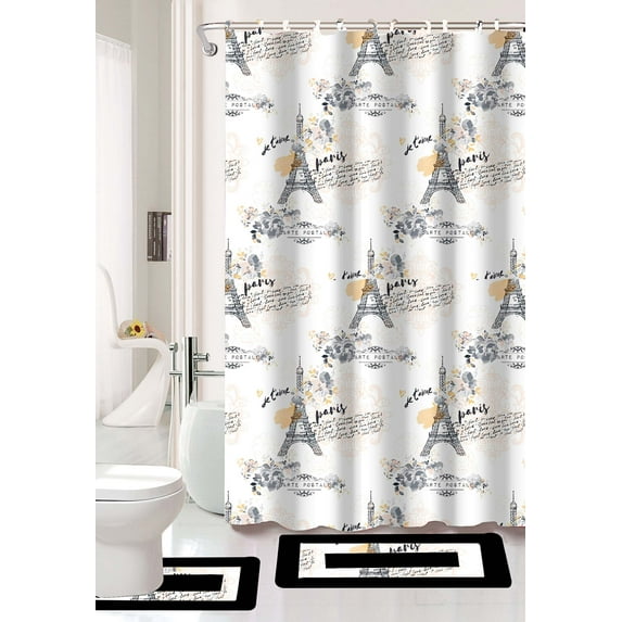 Hero image 0 of 15-PC Paris High Quality Jacquard Bathroom Bath Rug Set Washable Anti Slip Rug 17"x28", Contour Mat 17"x17" with Non-Skid Rubber Back and Shower Curtain 12 rings covered, 0 of 5