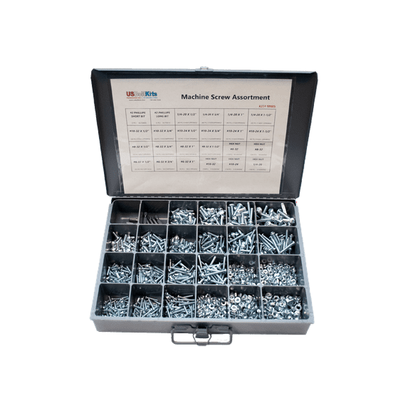 This small drawer assortment of 1500 pieces of Machine Screws is a great kit for the most commonly used machine screw sizes, nuts, and Phillips bits all in one convenient steel carrying case with latch.