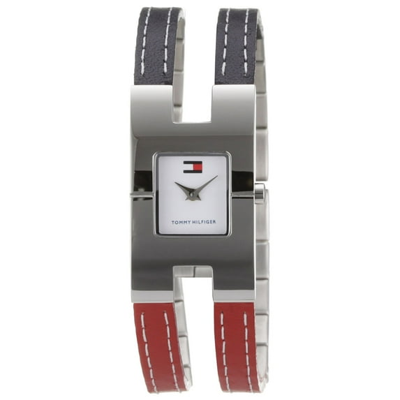 Tommy Hilfiger 1780068 women's watch features a 20mm wide and 7mm thick solid stainless steel case with a fixed bezel and smooth push-pull crown. Tommy Hilfiger 1780068 is powered by an accurate quartz movement. This beautiful watch also features a sharp looking milky white dial with silver tone luminous hands and hour markers, scratch resistant mineral crystal and water resistant to 30 meters. Tommy Hilfiger 1780068 is equipped with a 22mm wide twisted black-red leather and solid stainless steel band with a jewelry clasp. Tommy Hilfiger 1780068 women's white dial twisted leather & steel band quartz watch is brand new and comes in an original Tommy Hilfiger gift box and is backed by a 10 years for USA and 2 years international store warranty.