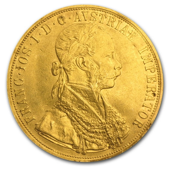 Gold 4 Ducats were first issued by the Kingdom of Austria in the first years of the 18th century, but only sporadically. The first year of striking without a gap until 1914 was 1854. The last regular issue of the 4-ducat denomination for circulation was in 1914 during the last years of the reign of Franz Joseph I, emperor of the Austro-Hungarian Empire, just before the start of World War I.