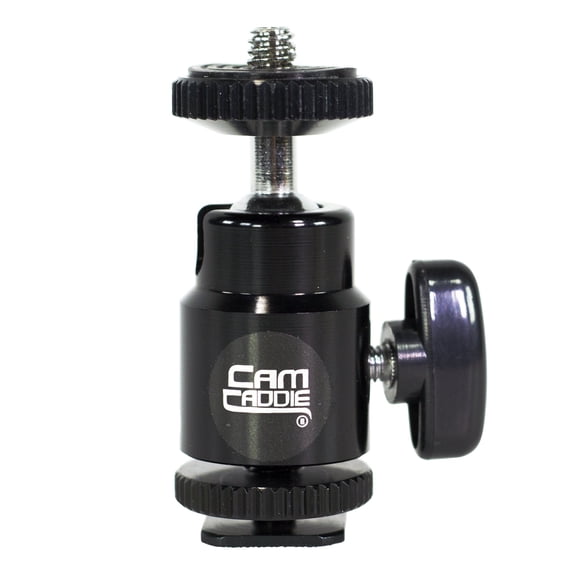 cam caddie 360 degree metal/steel mini ball head with lock and hot shoe adapter - most versatile ball head available with all 3 mounting options: flash shoe, 20 threaded post + -20 socket