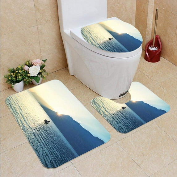 PUDMAD Man a Canoe Fishing Under an Amazing Sunset 3 Piece Bathroom Rugs Set Bath Rug Contour Mat and Toilet Lid Cover