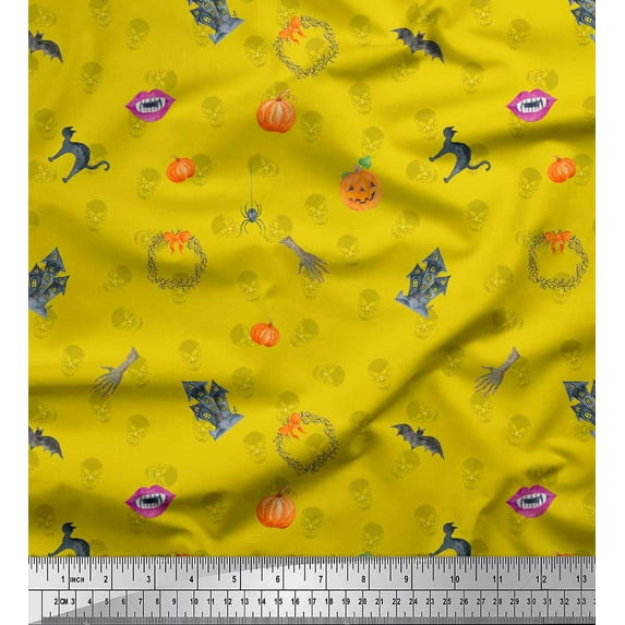 Soimoi Yellow Rayon Crepe Fabric Pumpkin & Haunted House Halloween Fabric Prints By Yard 46 Inch Wide