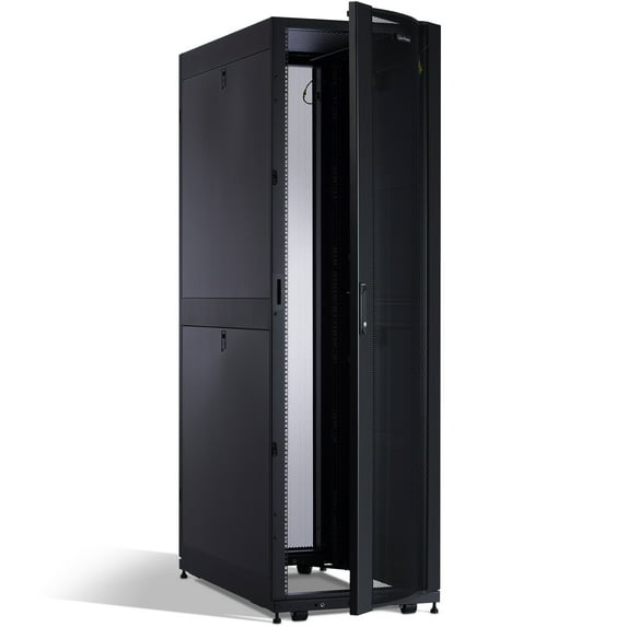 The CR42U11001 rack enclosure includes convenient top panel cable access openings, perforated doors for efficient airflow, adjustable rack angles, toolless vertical PDU mounting, and more. The CR42U11001 server cabinet ships fully assembled for quick deployment and can be customized with compatible accessories to meet specific requirements. It is covered by a 5-year limited warranty.