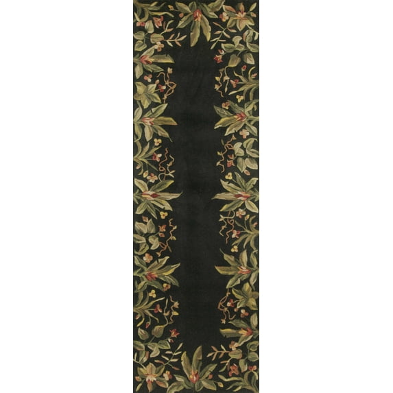 2' x 8' Black Tropical Leaves Bordered Wool Indoor Runner Rug