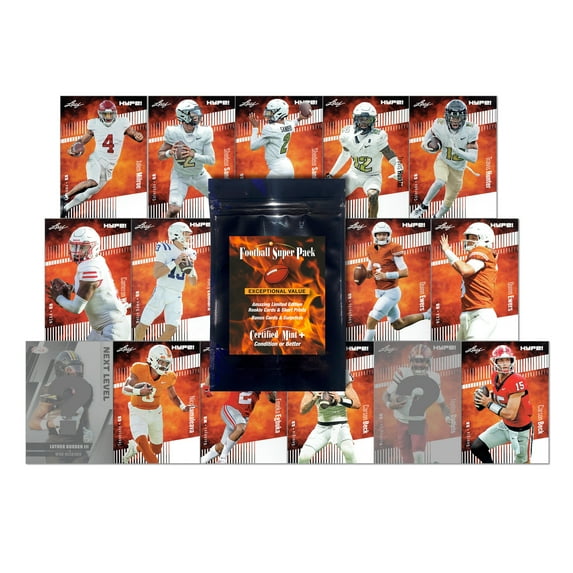 Introducing the 2025 Draft Superpack with 15 cards and extras! Every pack features 10 Leaf HYPE Limited Edition rookie cards including top projected 2025 picks like Shedeur Sanders from Colorado (2 cards) and Travis Hunter, the 2-way star and Heisman winner (2 cards). Also included is QB Cam Ward of Miami, QB Riley Leonard of Notre Dame, Texas QB Quinn Ewers (2 cards), QB Jalen Milroe from Alabama and, last but not least, elite Ohio State Wide Receiver Emeka Egbuka. Every card is limited to just 5000 made! We are also getting you started on future NFL drafts and Heismans with top projected picks and college football�s brightest stars: including Nico Iamaleava, star QB of Tennessee as well as Carson Beck, star QB from Georgia and now Miami (2 cards). Every Superpack will also include 2 bonus cards from this amazing group: 2024 Leaf HYPE Limited Edition Jayden Daniels Rookie of the Year card... OR 2023 Leaf HYPE Limited Edition rookie of 49ers #1 pick Ricky Pearsall... OR 2025 Sage Football Heisman finalist Ashton Jeanty... OR Arizona wideout Tetairoa McMillan... OR Mizzou wideout Luther Burden II... OR Penn state monster DE Abdul Carter. We'll send at least two, bringing the total to at least 15 cards in every Superpack! Certified Mint+ inventory is sourced directly, creating an uncirculated collectible that has never been handled. Note that cards are not individually encapsulated but will be packaged well-protected for future grading.