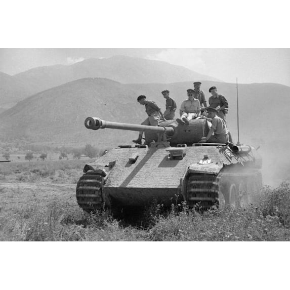 24x36 gallery poster, British officers ride on a captured Panther tank tank in Italy June 1944