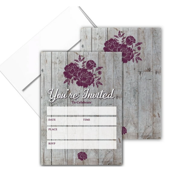 Stonehouse Collection 5 x 7 in. Rustic Flower Party Invitation Card Send out a classy invitation to all your near and dear ones as you invite them to be a part of an occasion that is important to you and your loved ones. Impress all the guests with this beautiful rustic flower party invitation card. The invite has a beautiful wine color floral motif on either side against a rustic wooden base. This fill-in-invitation card is perfect for bridal showers, wedding parties, classy home parties, etc. This invitation card is printed on an A7 card stock paper with a glossy surface that is easy to write on.