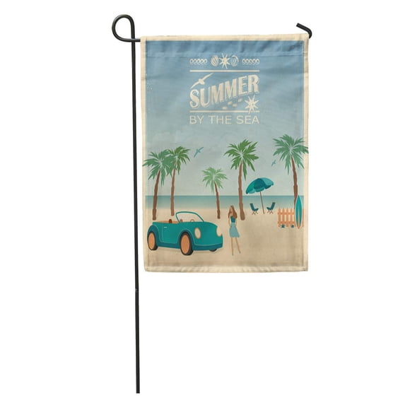 SIDONKU Summer Color in Retro Car Palm Trees and Young Woman Garden Flag Decorative Flag House Banner 12x18 inch