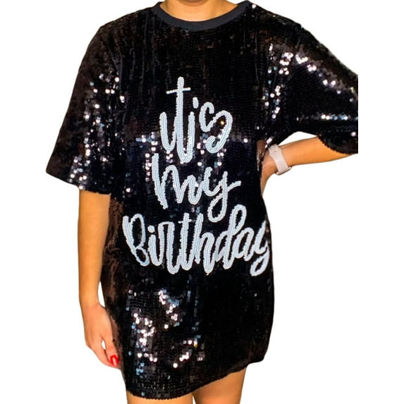 Hero image 0 of 2Chique Boutique Women's It's My Birthday Sequin T Shirt Dress Black One Size Sequin on One Side, 0 of 6