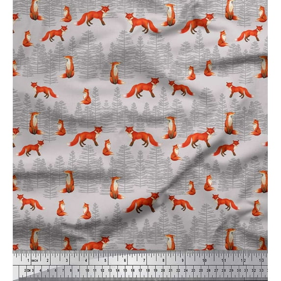 Soimoi Gray Georgette Viscose Fabric Cedar Tree & Fox Animal Printed Craft Fabric by the Yard 42 Inch Wide