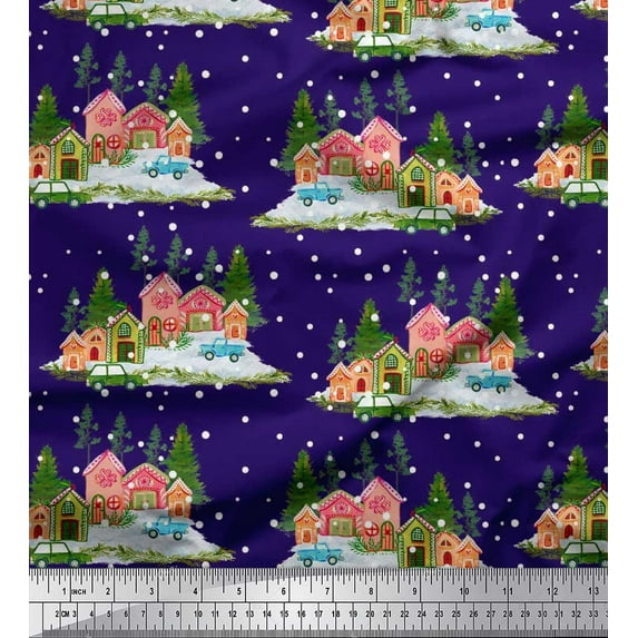 Soimoi Moss Georgette Fabric House,Snowfall & Tree Nature Decor Fabric Printed Yard 42 Inch Wide