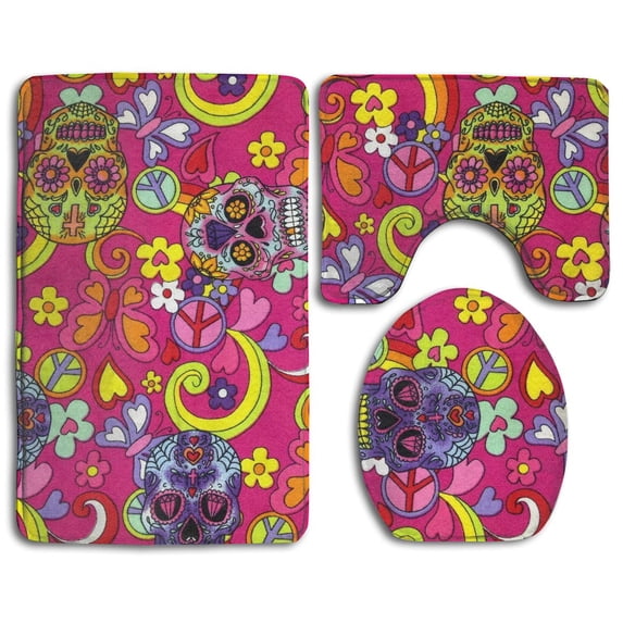 Hero image 0 of PUDMAD Pink Hippy Sugar Skulls Butterflies 3 Piece Bathroom Rugs Set Bath Rug Contour Mat and Toilet Lid Cover, 0 of 2