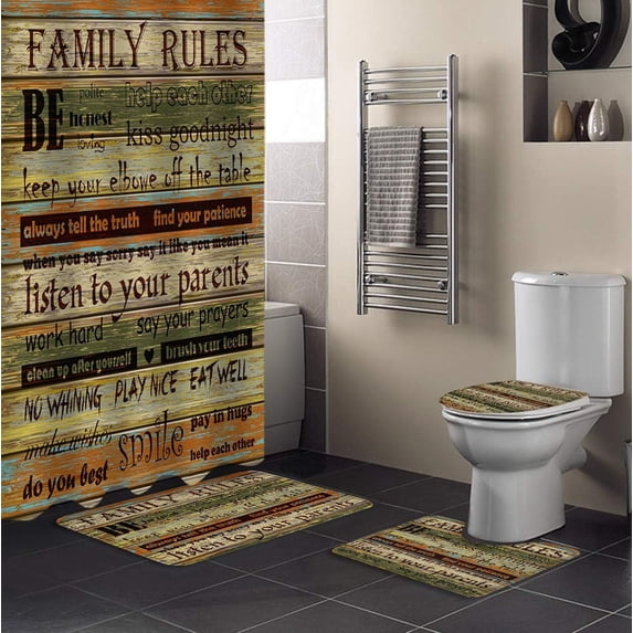 Hero image 0 of FMSHPON Family Rules 4 Piece Bathroom Set Shower Curtain Bath Rug Contour Mat and Toilet Lid Cover, 0 of 8